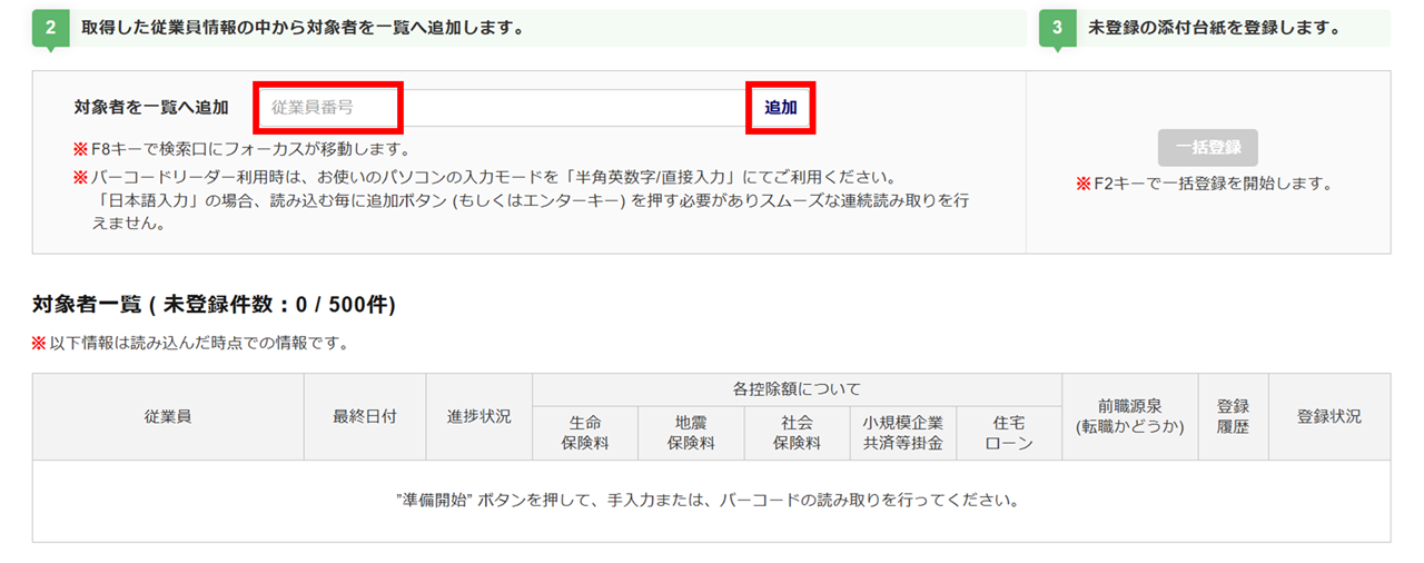 対象者の追加方法は、「従業員番号を入力して追加」する方法と「バーコードリーダーを利用して追加」する方法の2種類があります。