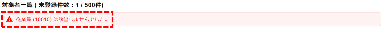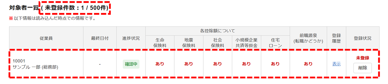 正常に追加がおこなわれると、対象者一覧の未登録件数に件数がカウントされ、対象者一覧の最上段に従業員情報が追加されます。