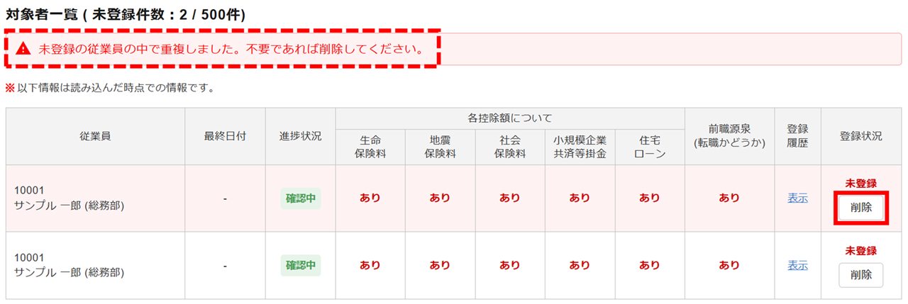 すでに登録している従業員に対し、再度登録をおこなうと、対象者一覧に2行で表示されます。