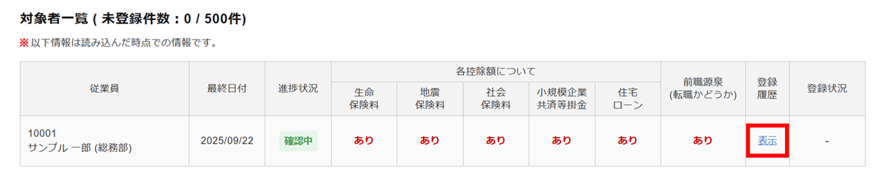 また、「登録済」になると、対象者一覧の未登録件数が0件に変更されます。
