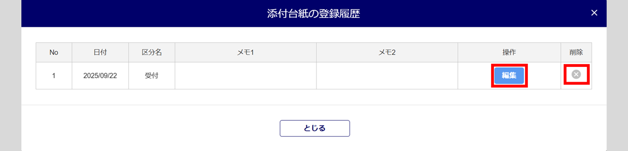区分名 | 添付台紙の「受付」または「発送」どちらの登録をおこなうか選択します。 |