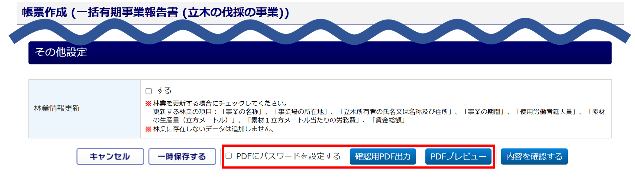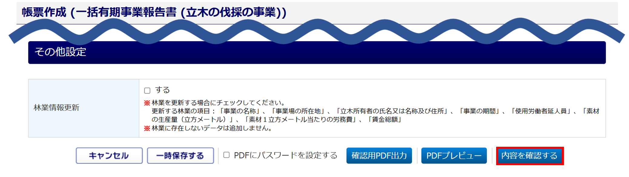 「する」にチェックすると、本手続き画面で入力した内容を林業管理へ更新することができます。更新対象項目については、以下の【対象項目】をご確認ください。更新対象の項目については、システム画面からも確認できます。「林業情報更新」項目の「」をご確認ください。