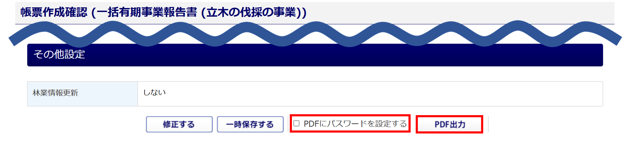 「一括有期事業報告書 (立木の伐採の事業)」が出力されます。