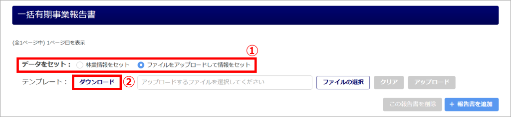 [林業管理]に登録している林業情報を「一括有期事業報告書」欄に引用する場合は、[林業情報セット]()をクリックします。