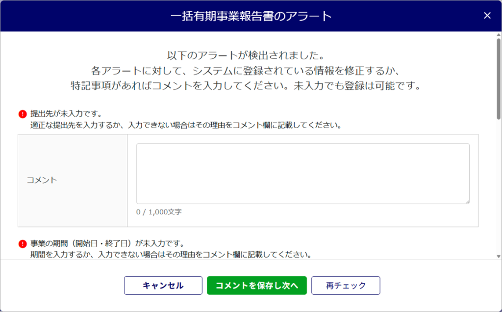 アラート内容を確認し、入力内容を修正、もしくは「コメント」欄にを入力し[コメントを保存し次へ]をクリックして次の操作へお進みください。