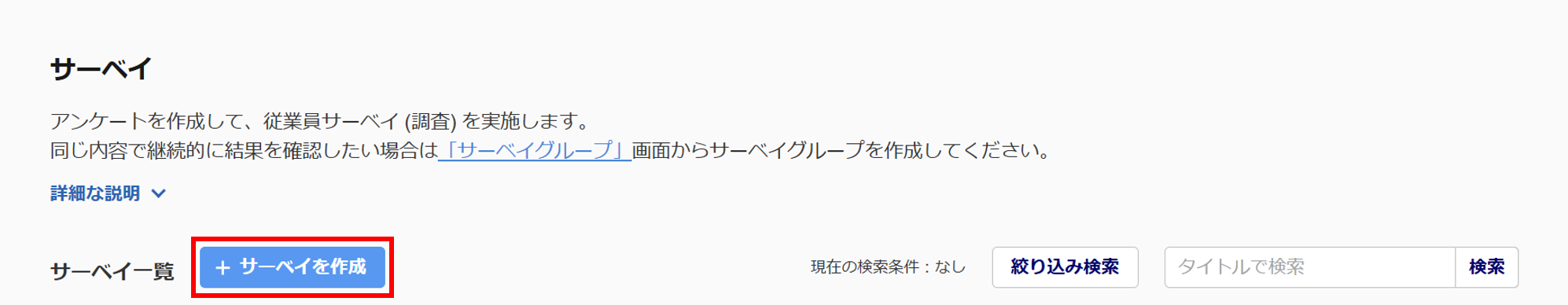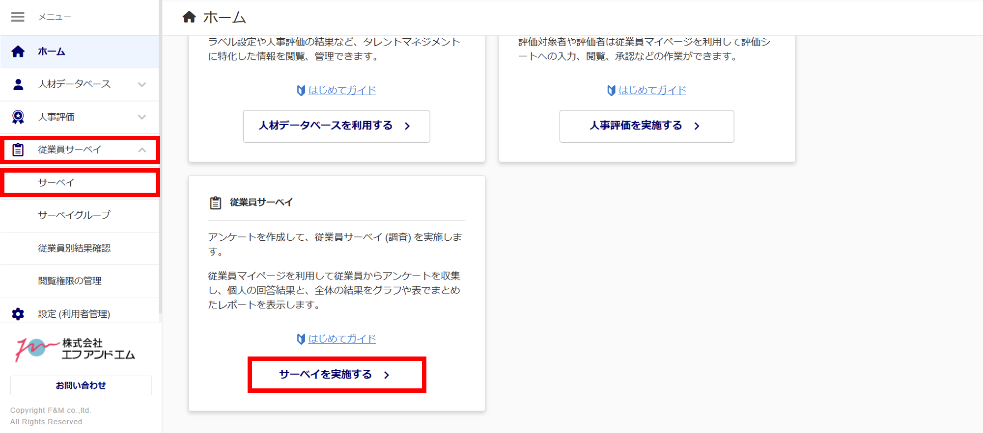 メニュー[従業員サーベイ]>[サーベイ]または、ホーム画面内[サーベイを実施する]をクリックします。