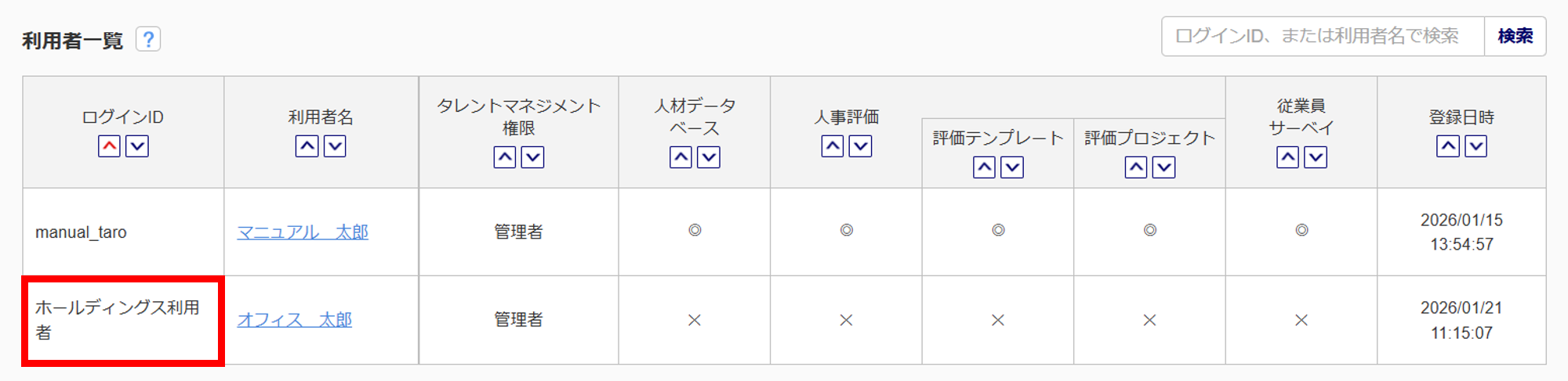 ホールディングス利用者に、「タレントマネジメント」機能の利用権限を付与している場合、利用者一覧の「ログインID」欄に「ホールディングス利用者」と表示されます。