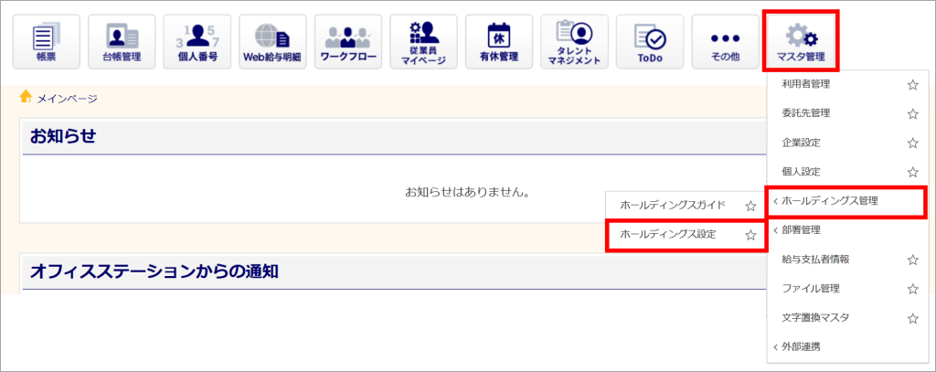 [マスタ管理]>[ホールディングス管理]>[ホールディングス設定]をクリックします。