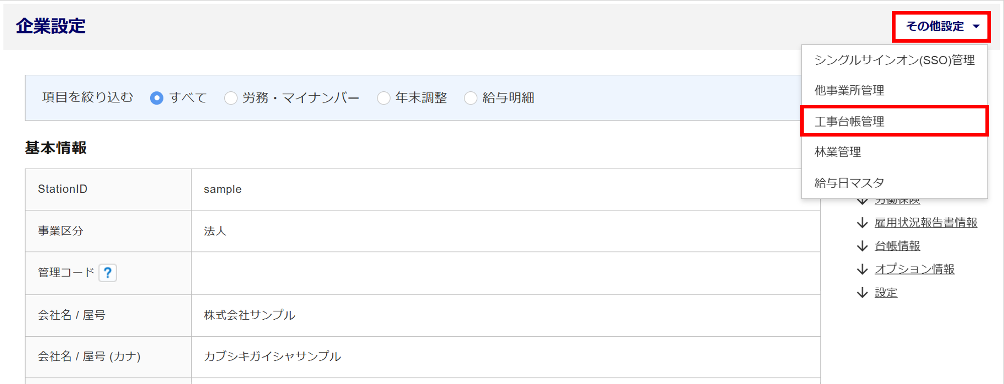 [その他設定]>[工事台帳管理]をクリックします。