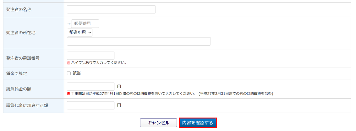 請負代金の額は「工事開始日」が平成27年4月1日以降の場合、消費税を除いて入力します。