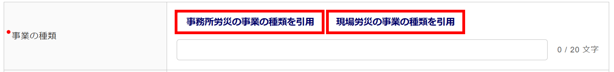 [事務所労災の事業の種類を引用]または[現場労災の事業の種類を引用]をクリックすると、二元適用事業の情報を引用することができます。