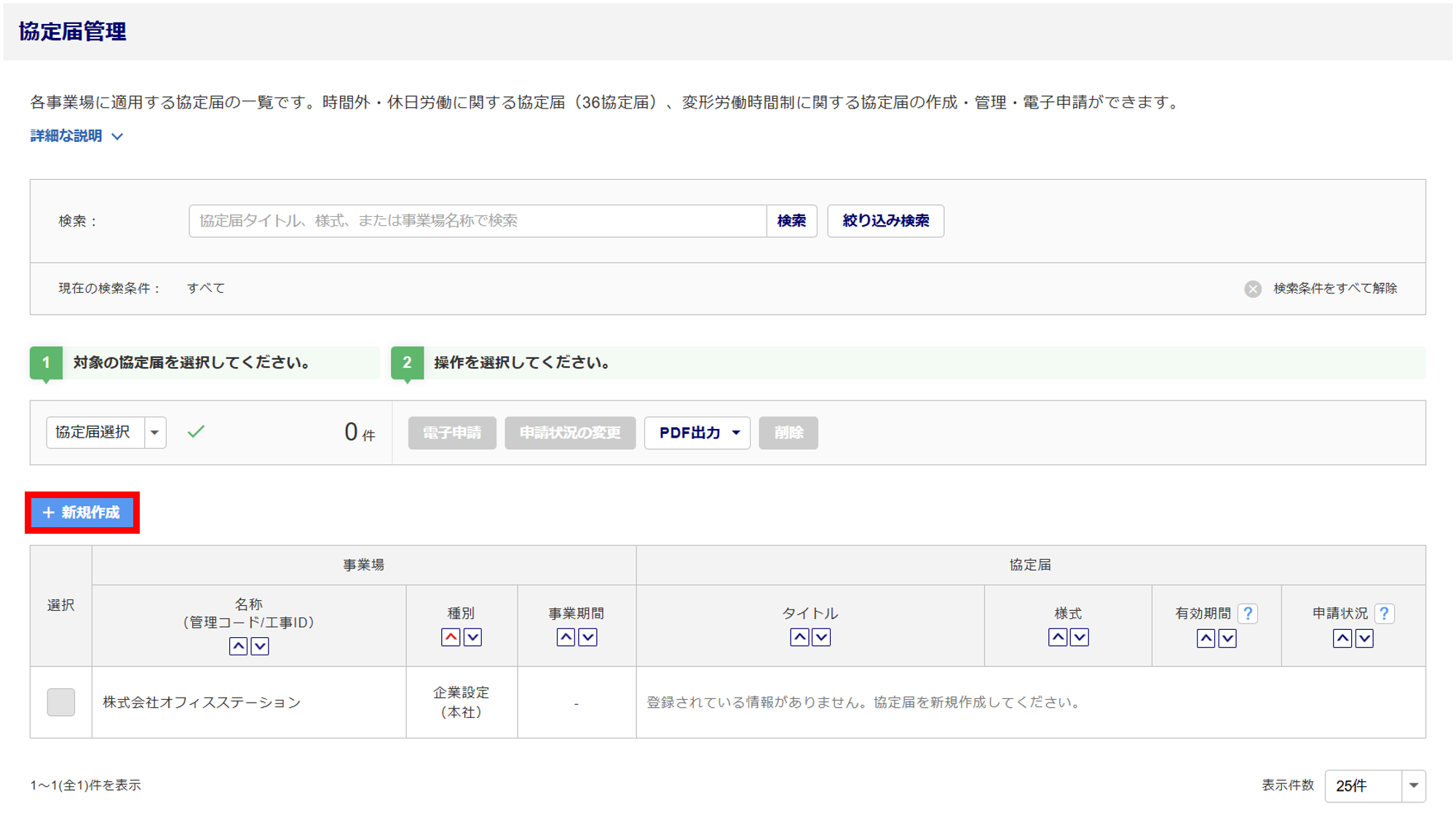 [一覧に戻る]をクリックし、「協定届管理」画面から作成した協定届の編集をおこなってください。