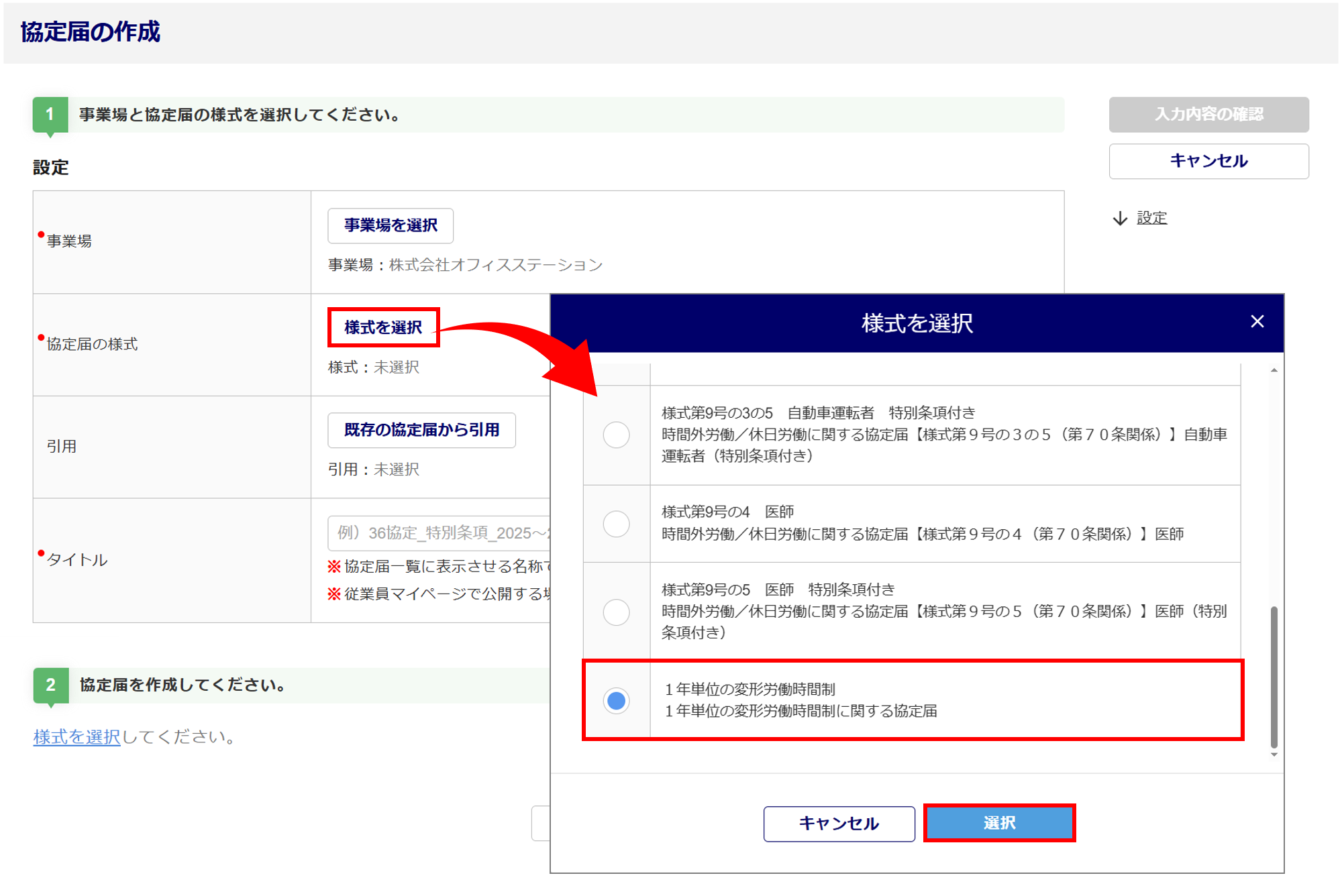 [様式を選択]から「1年単位の変形労働時間制 1年単位の変形労働時間制に関する協定届」を選択後、[選択]をクリックします。