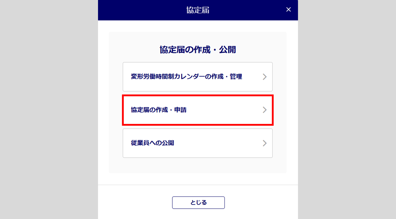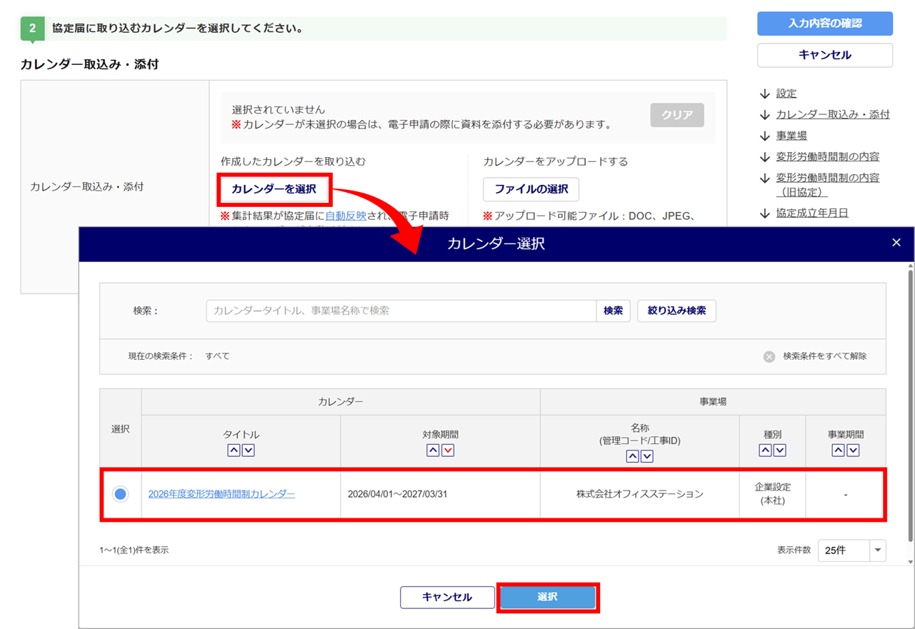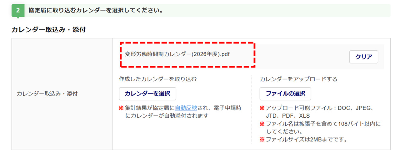 選択したカレンダーの集計結果を協定届に自動反映し、電子申請時にカレンダーを自動添付します。