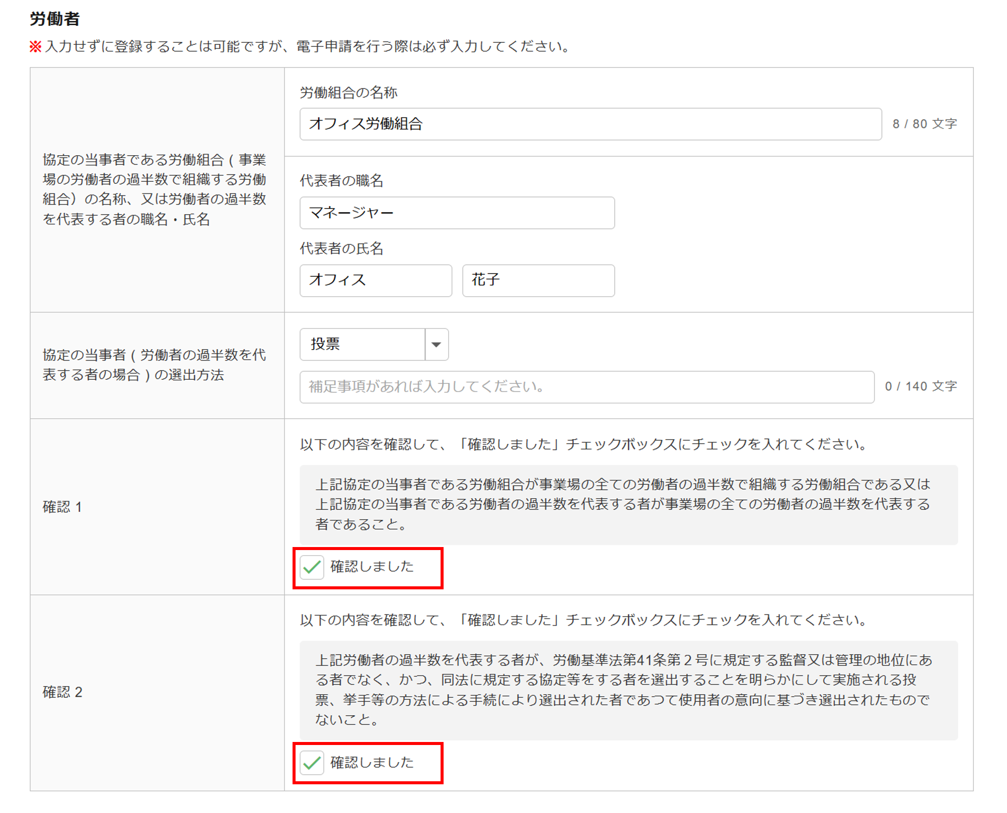 「労働組合の名称」もしくは、「代表者の職名」と「代表者の氏名」※が必須入力となります。