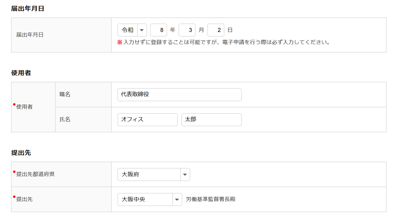 ※「使用者」と「提出先」の情報は、[事業場を選択]で選択した事業場の「代表者役職」「代表者氏名」「管轄労