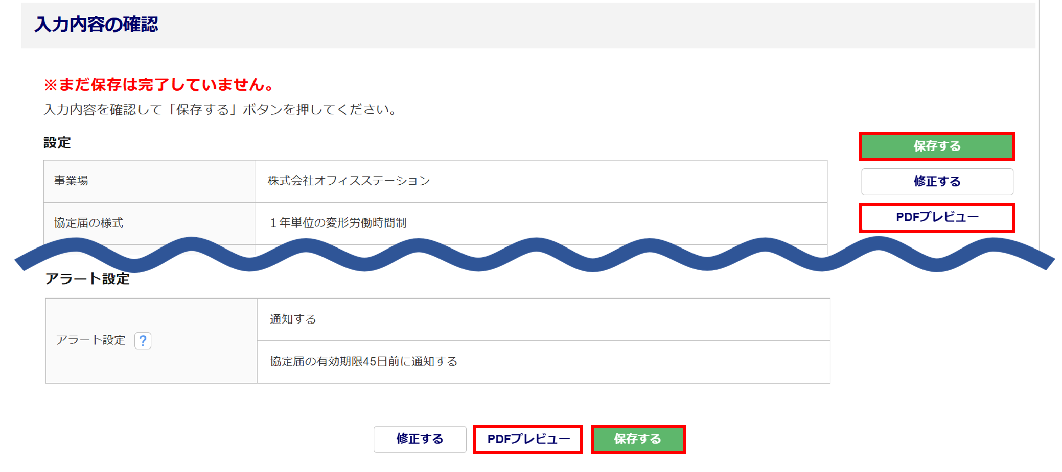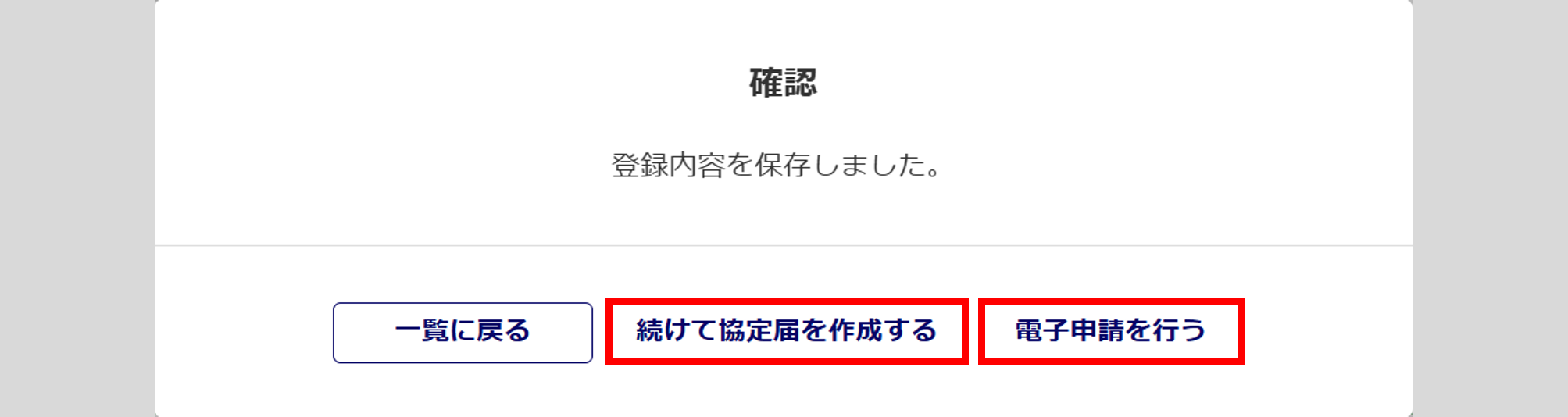 作成した協定届を保存すると、「確認」画面が表示されます。