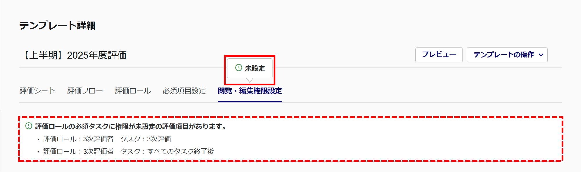評価ロール者の対象タスクに「閲覧・編集権限設定」が登録されていない場合、「閲覧・編集権限設定」画面に「未設定」のマークと、設定されていない評価項目の詳細が表示されます。