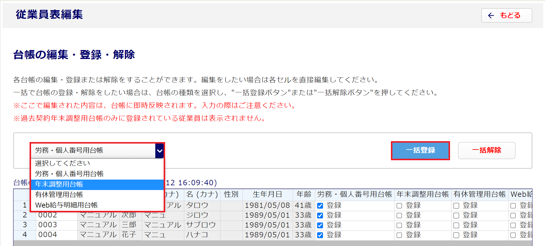 本画面に表示されている全従業員(退職者含む)に対し、選択した台帳利用者として登録します。