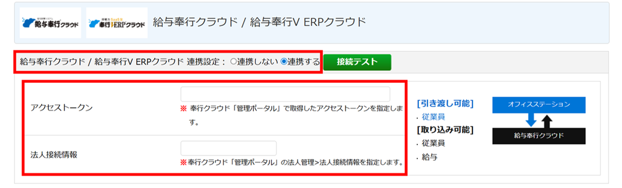 「給与奉行クラウド / 給与奉行V ERPクラウド 連携設定」に「連携する」を選択し、「アクセストークン」「法人接続情報」を入力します。