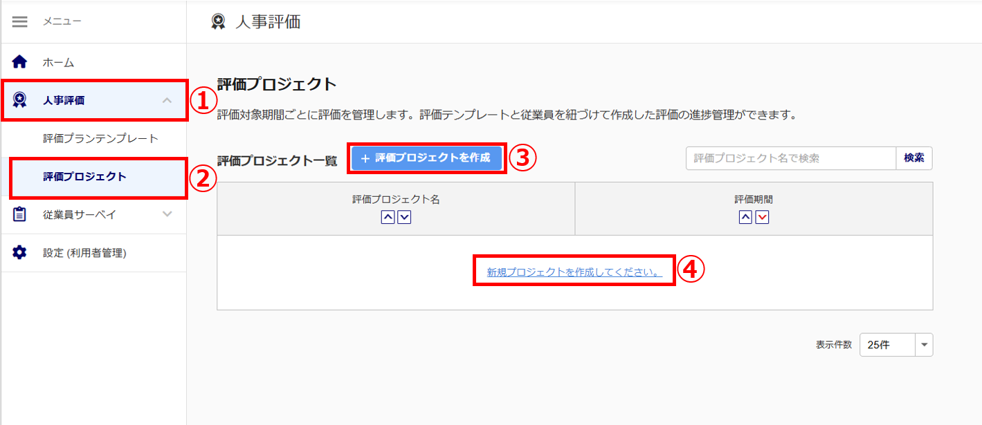 メニュー[人事評価](①)>[評価プロジェクト](②)>[評価プロジェクトを作成](③)または「新規プロジェクトを作成してください。」(④)をクリックします。