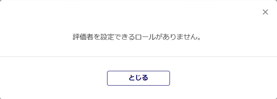 [評価者を設定]をクリック後に、以下の画面が表示された場合は、評価フロー画面で評価ロールが正しく設定されていない可能性があります。詳細については、以下の関連記事をご参照ください。