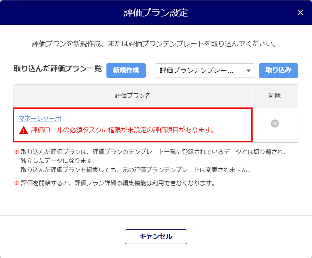 画面上部に「評価プランテンプレート取込の処理が完了しました。」と表示されたら、取込完了です。注意点