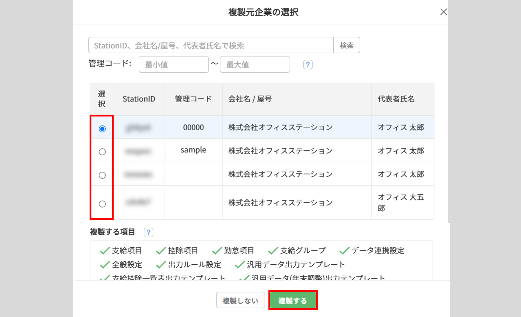 複製元の企業を選択し、[複製する]>[複製する]>[はい]をクリックすると、情報を複製できます。