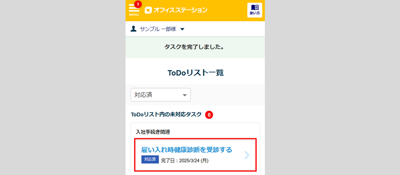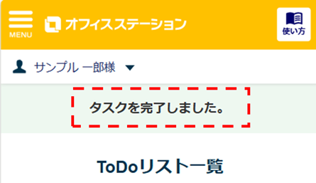 [タスクを完了]をクリックすると、トップページに「タスクを完了しました。」と表示されます。