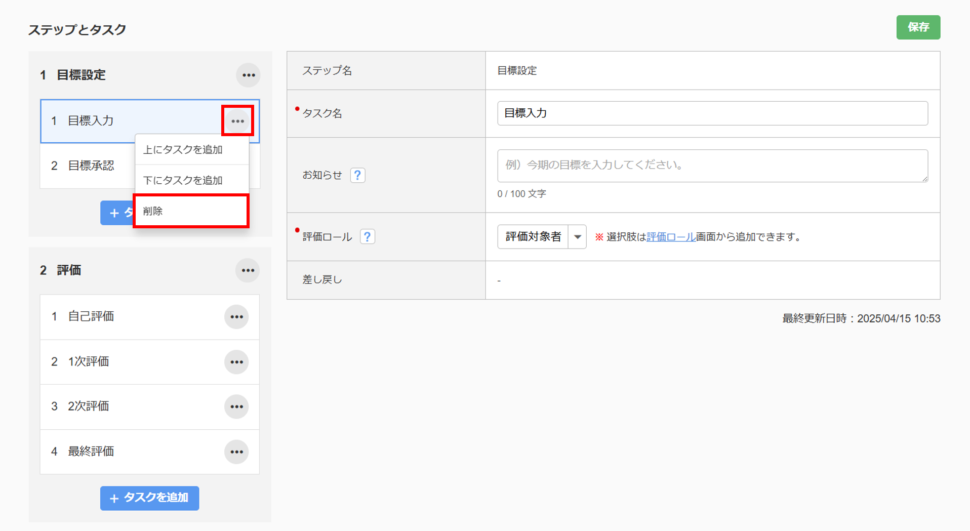 | 評価ロール | タスクを担当する役割を設定します。役割は「評価ロール」から追加できます。 |