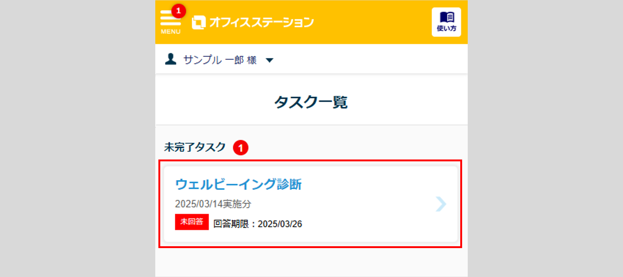勤務先より従業員に対して発行された「ウェルビーイング診断」サーベイは、「タスク一覧」に未完了タスクとして表示されます。