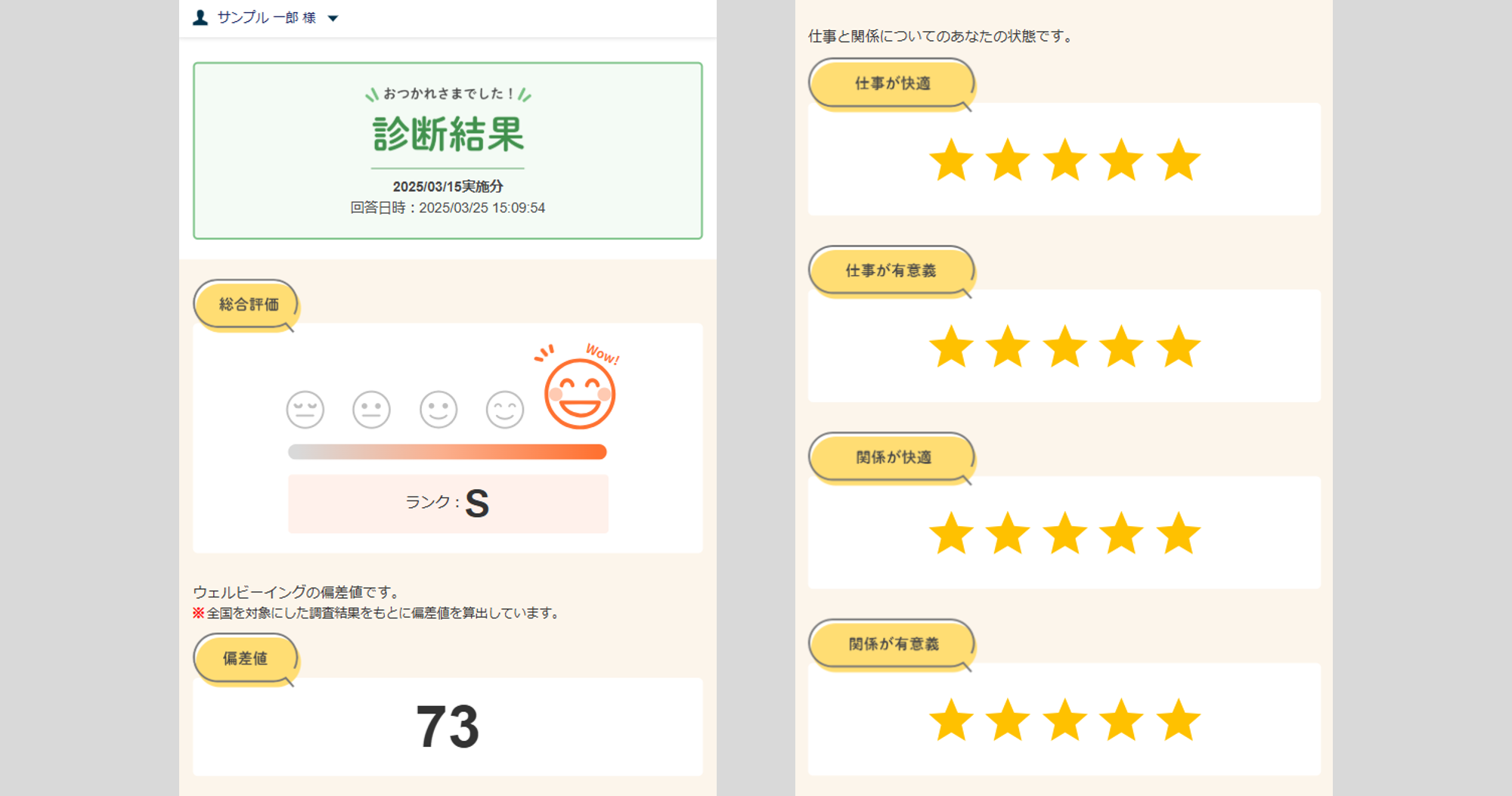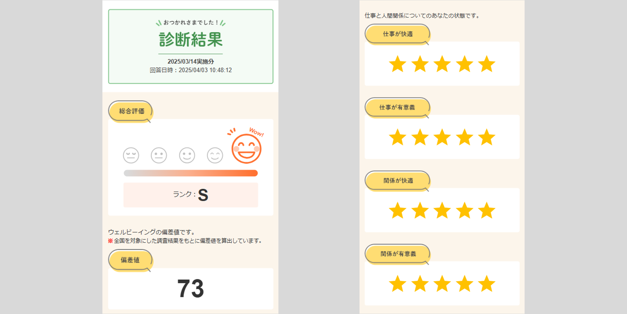 「回答済みのサーベイ」から実施分のウェルビーイング診断をクリックすると、診断を実施した際の偏差値などの詳細を確認できます。