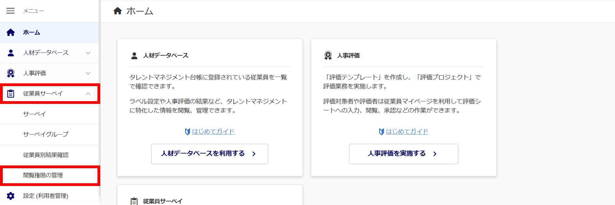 メニュー[従業員サーベイ]>[閲覧権限の管理]をクリックします。