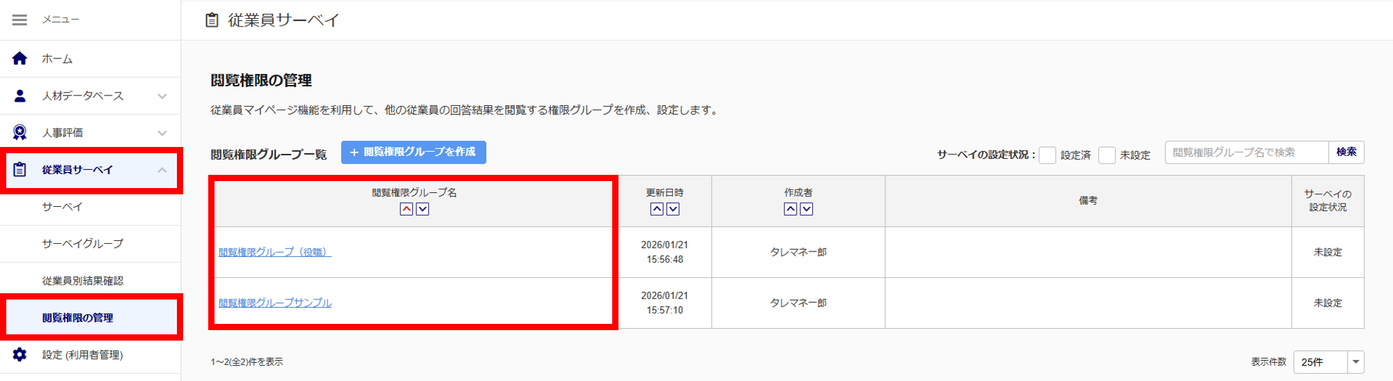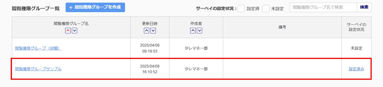 「閲覧権限グループ一覧」の「サーベイの設定状況」でサーベイに設定されているか確認できます。