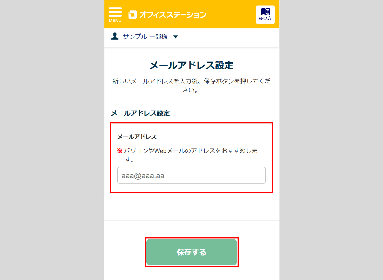 「メールアドレス」を入力し、[保存する]をクリックします。
