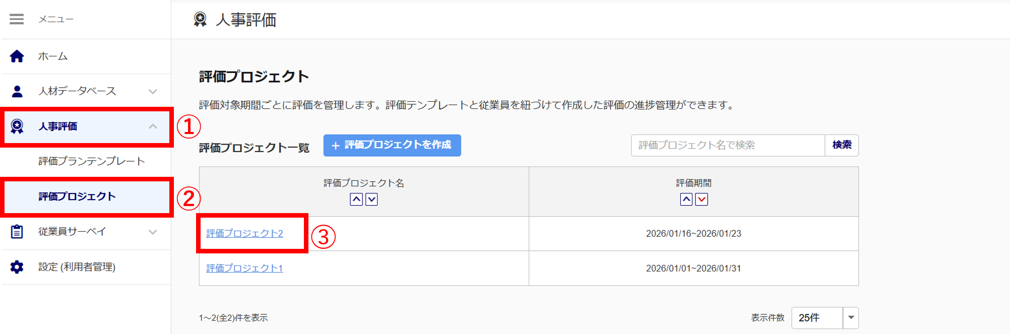 メニュー[人事評価](①)>[評価プロジェクト](②)>対象の評価プロジェクト名(③)をクリックします。