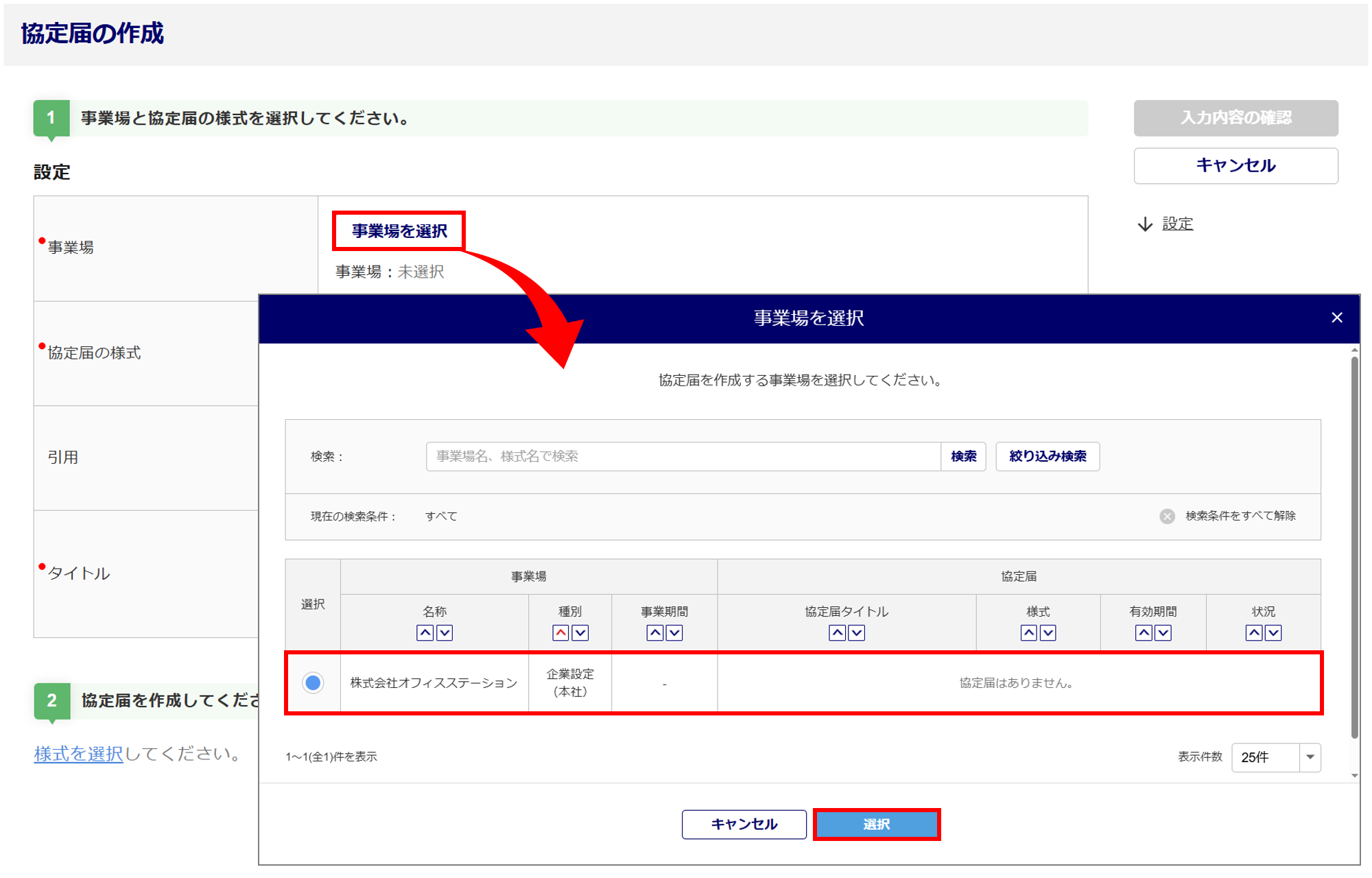 [事業場を選択]から、協定届を作成する事業場情報を選択後、[選択]をクリックします。