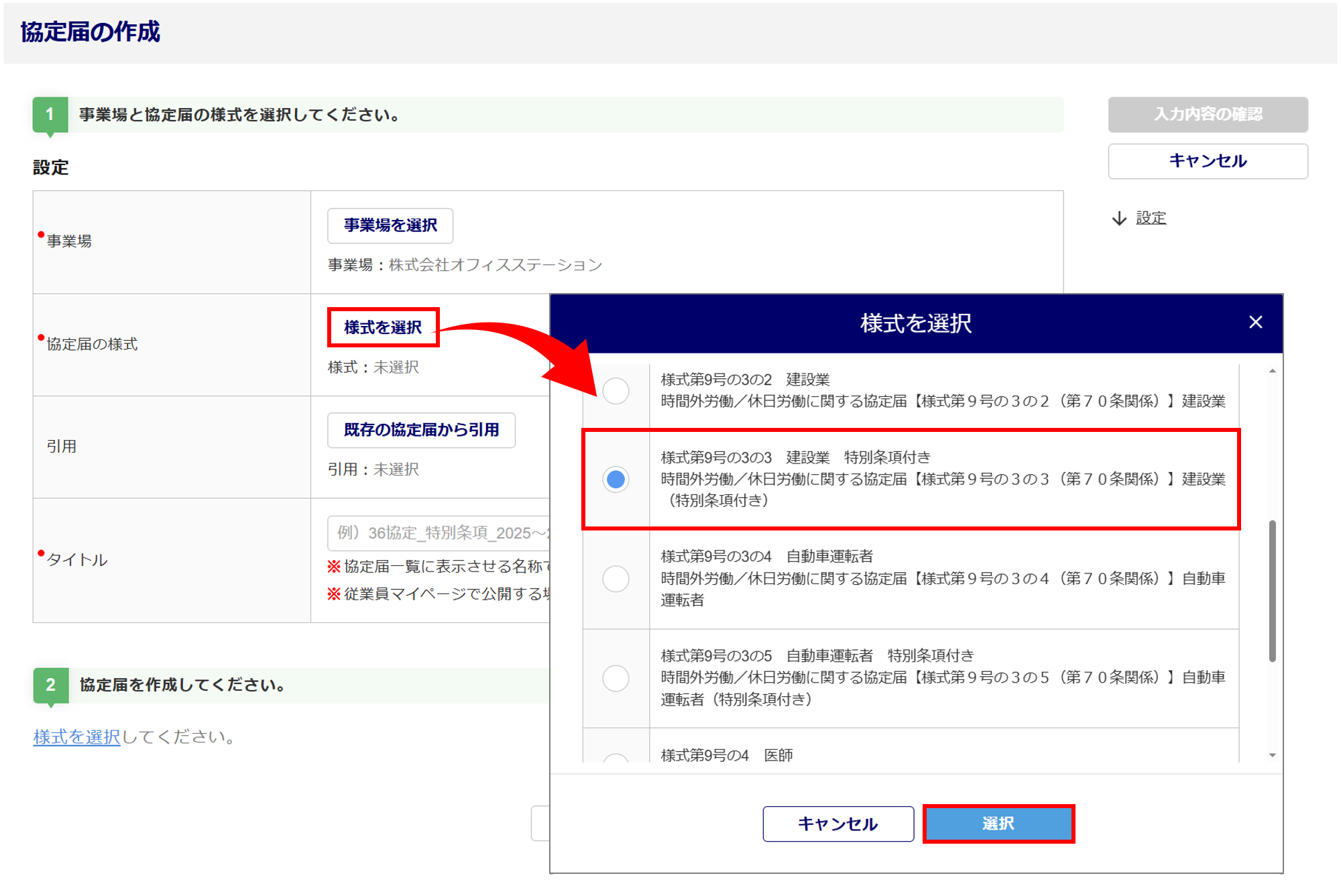 [様式を選択]から「様式第9号の3の3 建設業 特別条項付き 時間外労働/休日労働に関する協定届【様式第9号の3の3(第70条関係)】建設業(特別条項付き)」を選択後、[選択]をクリックします。