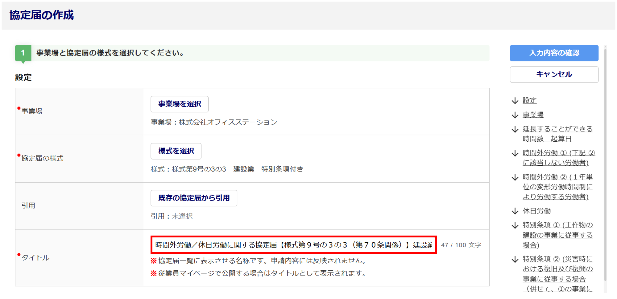 ※入力したタイトルは、協定届の内容へは反映せず、協定届一覧画面に表示します。