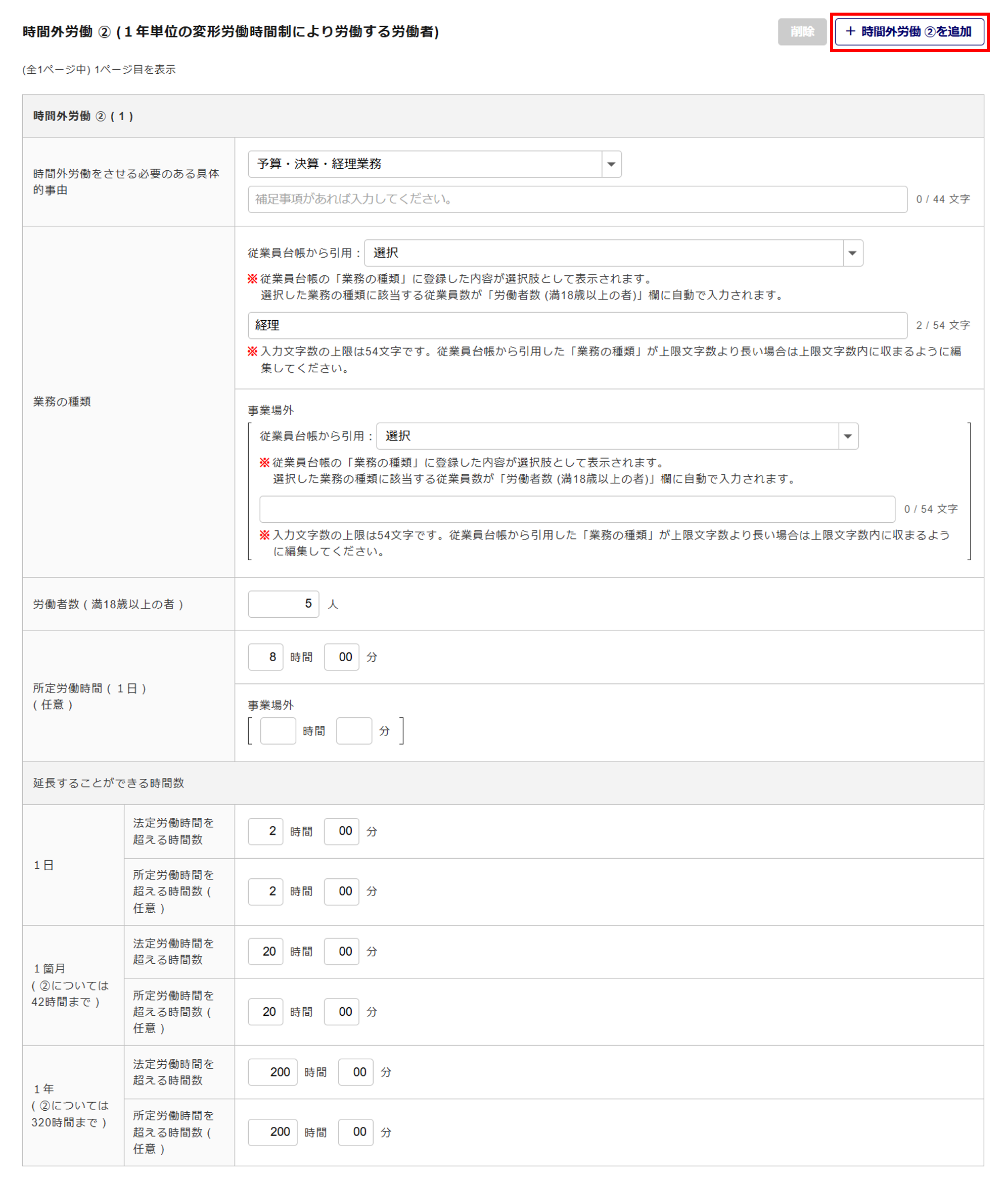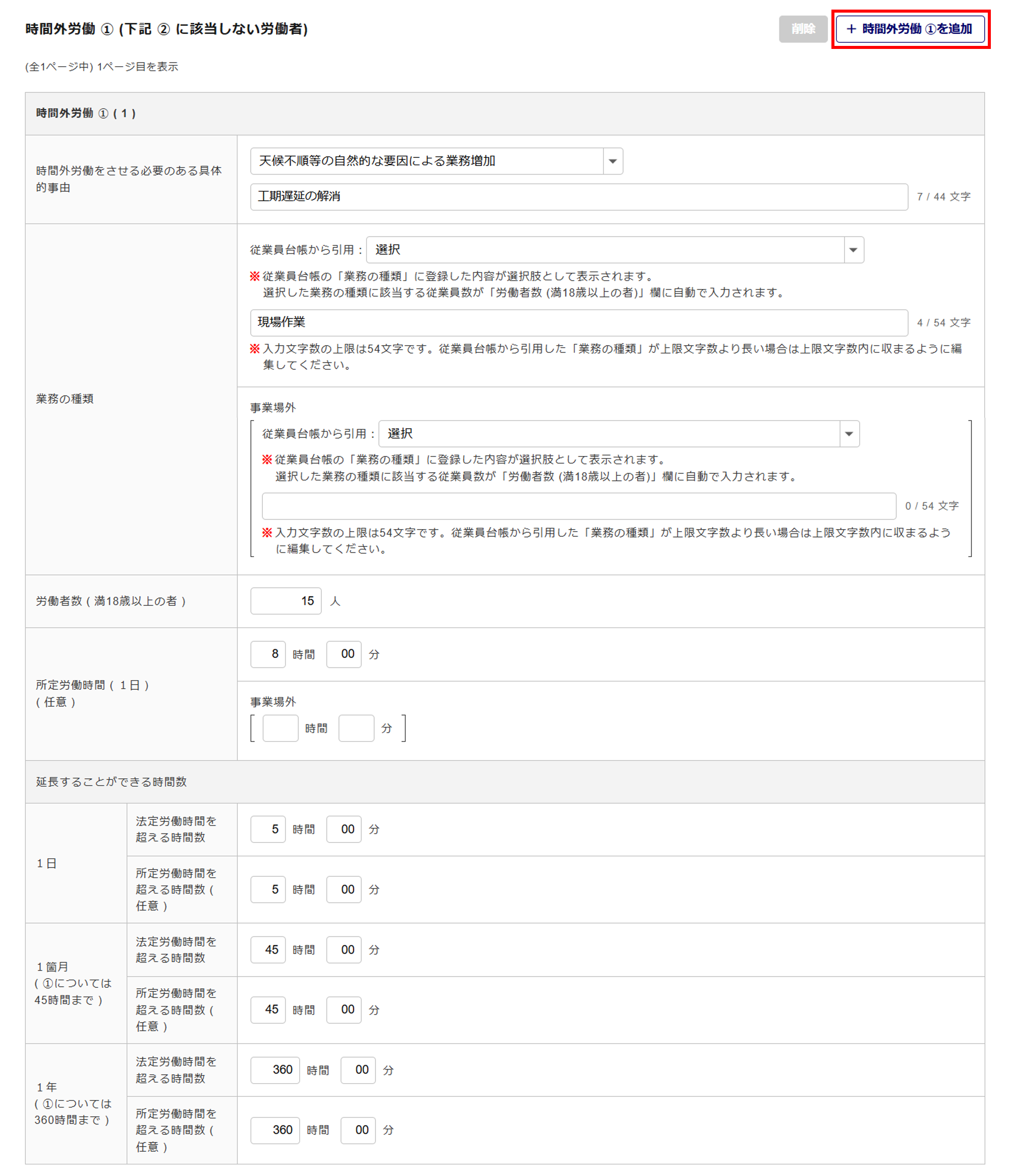 追加で情報を入力する場合は、[+時間外労働 ① を追加]をクリックします。