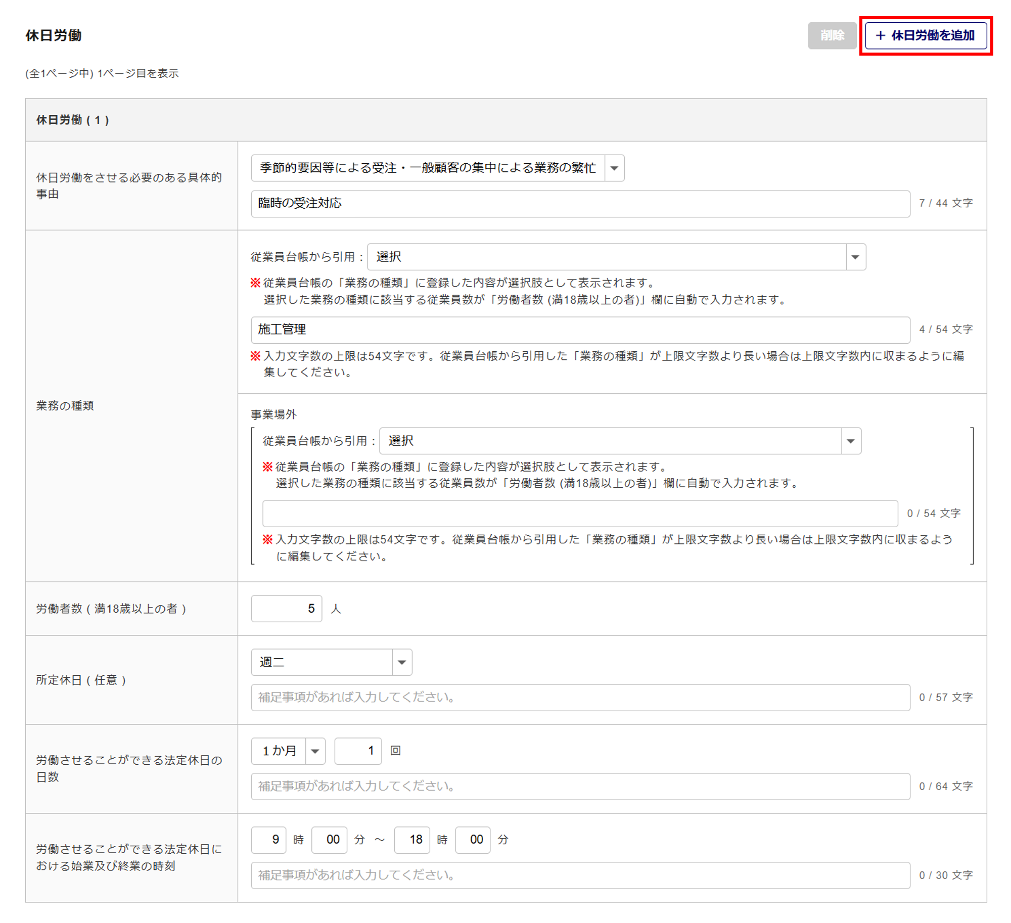 追加で情報を入力する場合は、[+休日労働を追加]をクリックします。