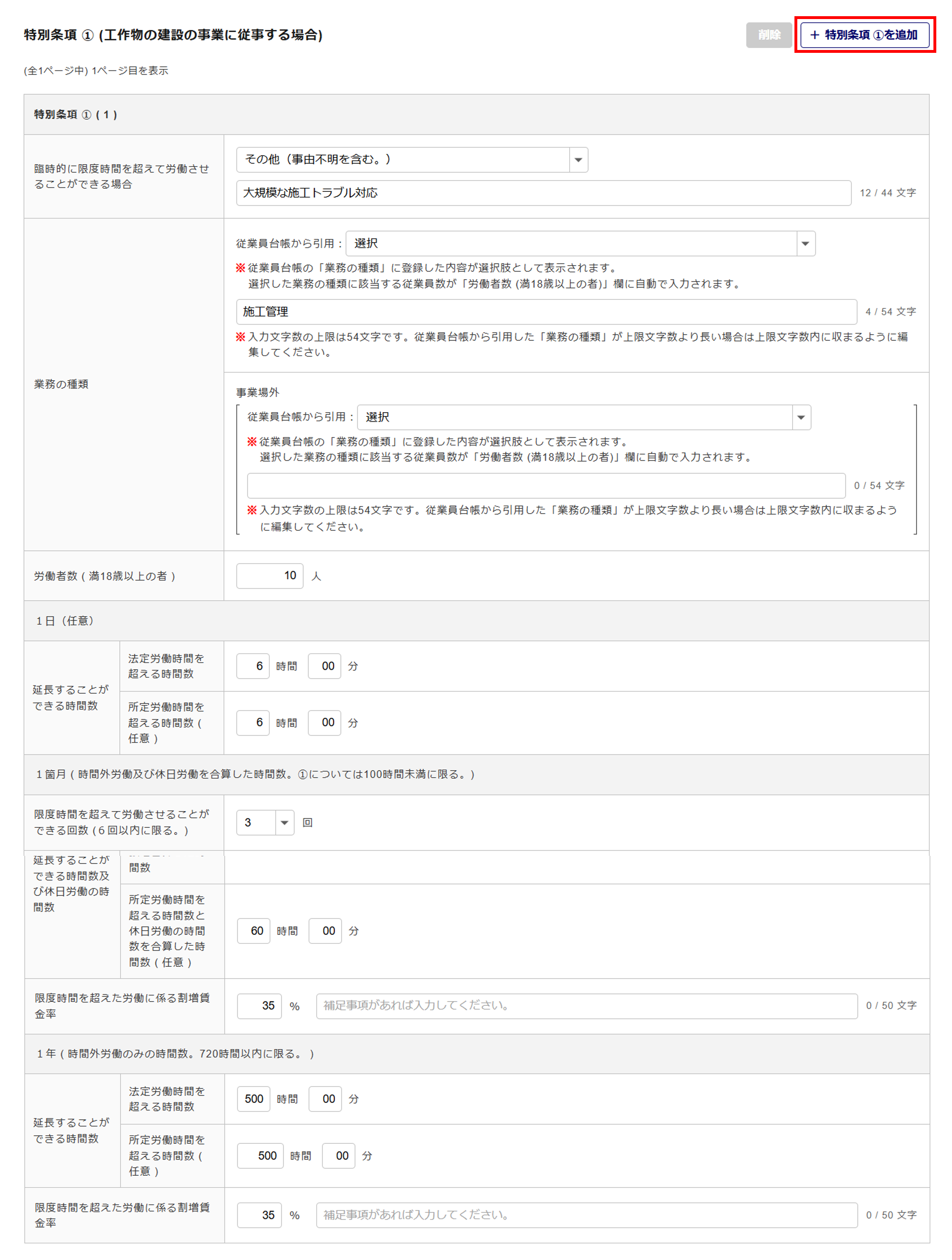 追加で情報を入力する場合は、[+特別条項①を追加]をクリックします。