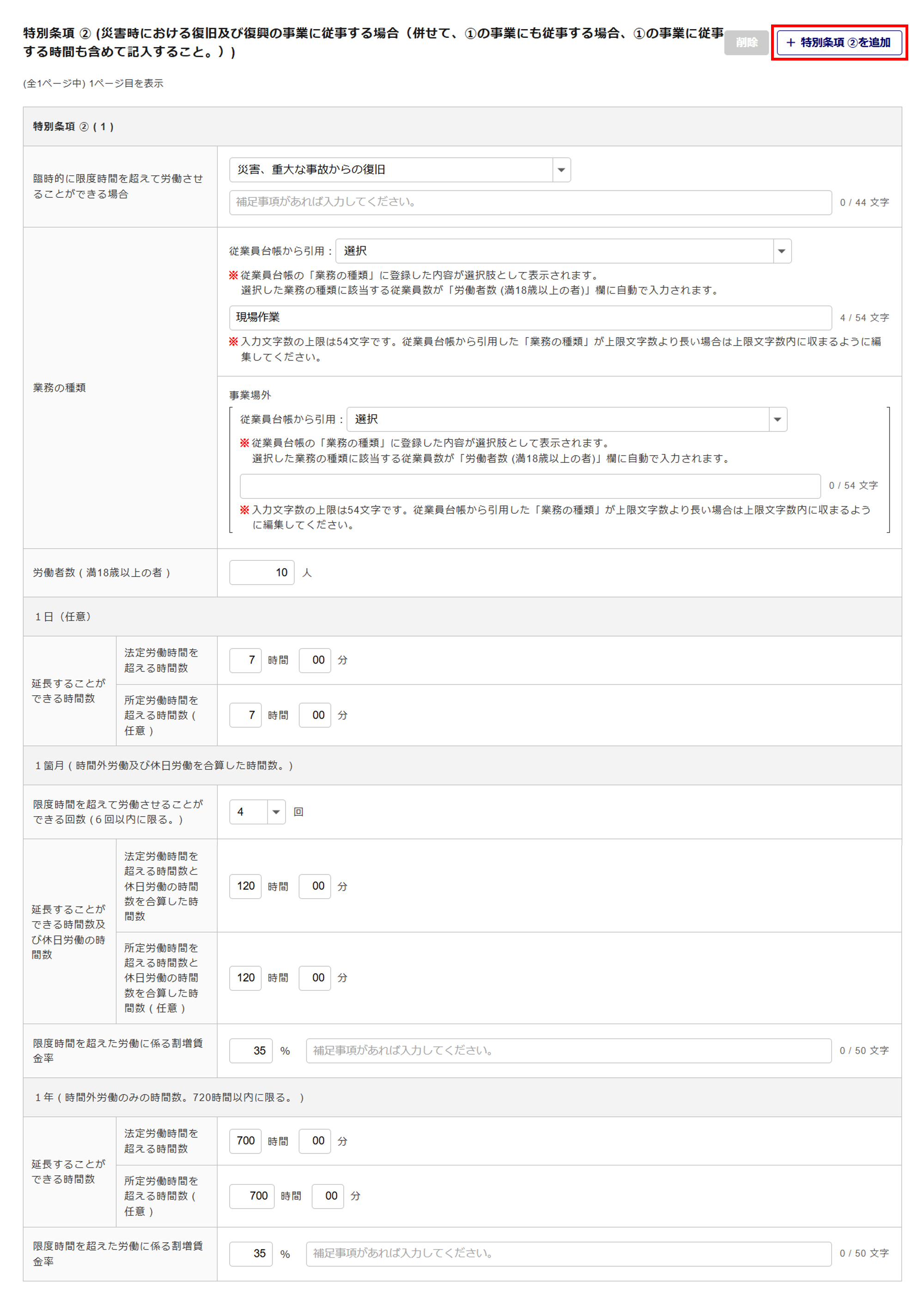 本帳票は、「特別条項 ①(工作物の建設の事業に従事する場合)」または「特別条項 ②(災害時における復旧及び復興の事業に従事する場合)」いずれかの情報を入力する必要があります。