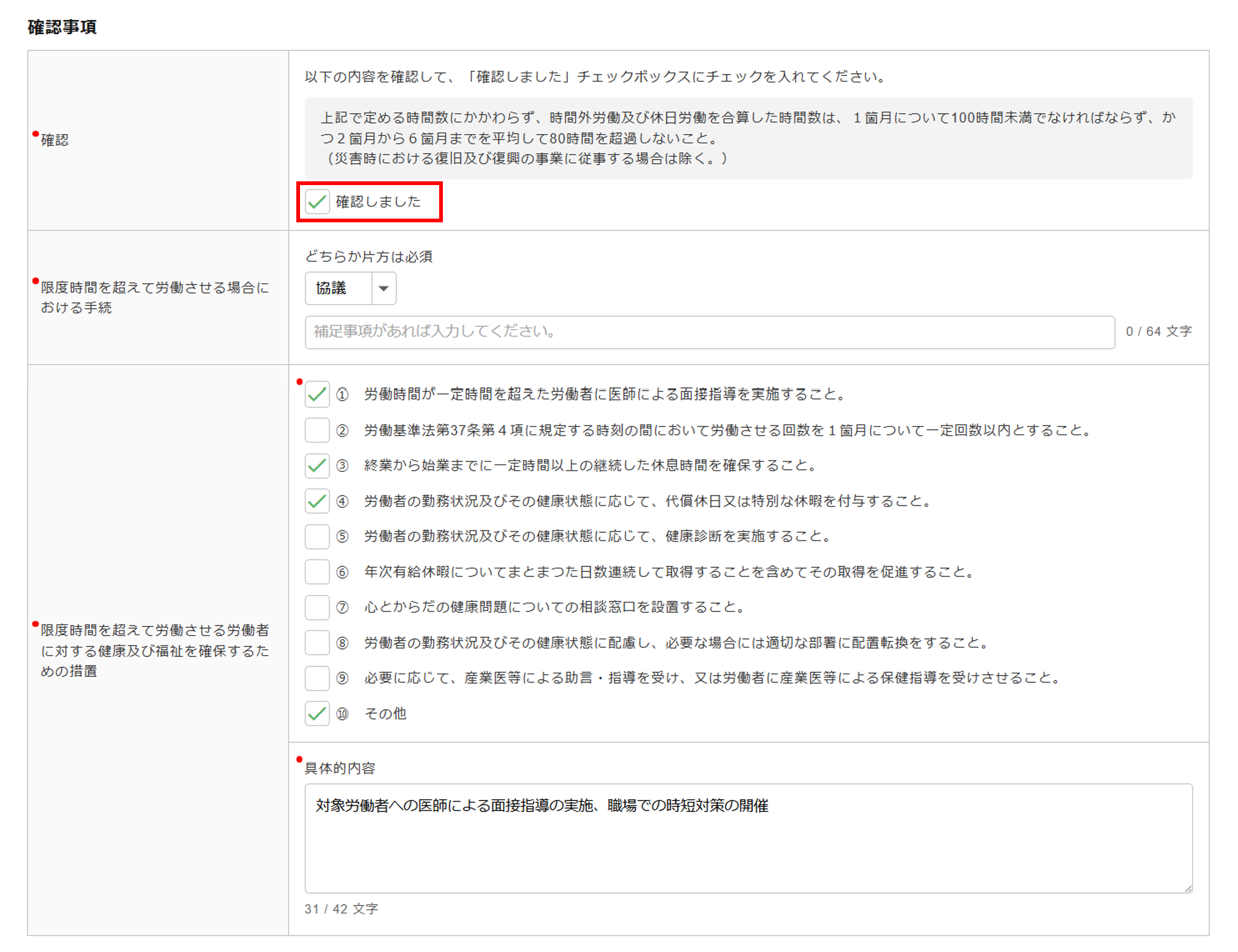 ※「限度時間を超えて労働させる労働者に対する健康及び福祉を確保するための措置」は複数選択可能です。