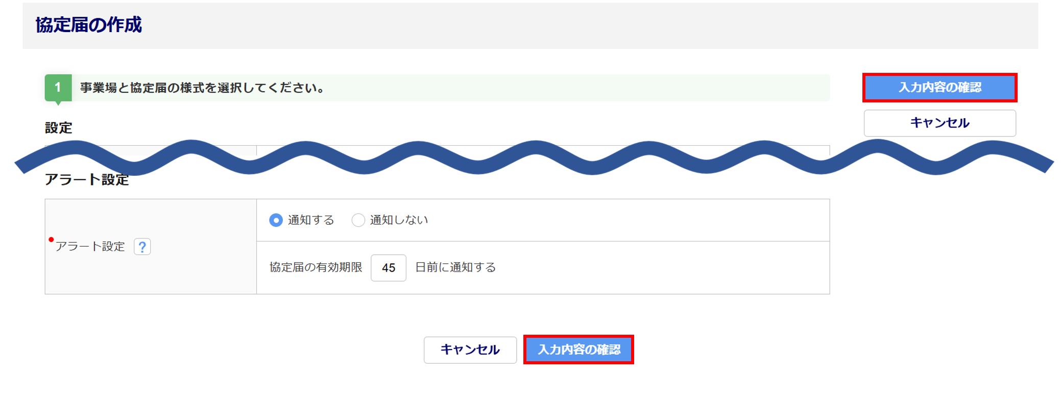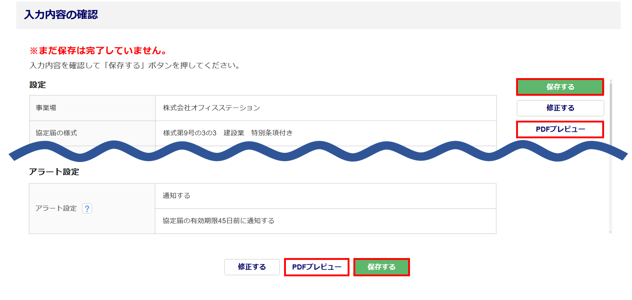作成した協定届を保存すると、「確認」画面が表示されます。
