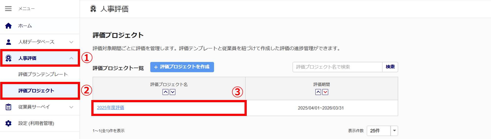 メニュー[人事評価](①)>[評価プロジェクト](②)>対象の評価プロジェクト名(③)をクリックします。