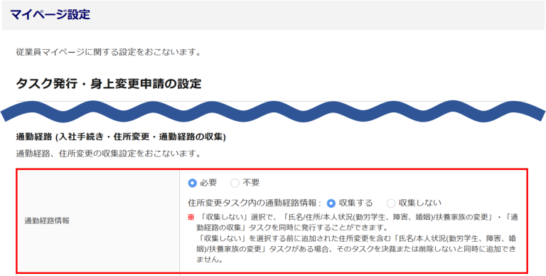 [マスタ管理]>[マイページ管理]>[マイページ設定]の「通勤経路 (入社手続き・住所変更・通勤経路の収集)」カテゴリ「通勤経路情報」に「必要」と設定している場合に、通勤経路の収集タスクを発行できます。