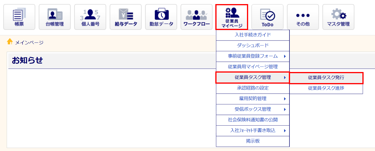 [従業員マイページ]>[従業員タスク管理]>[従業員タスク発行]をクリックします。