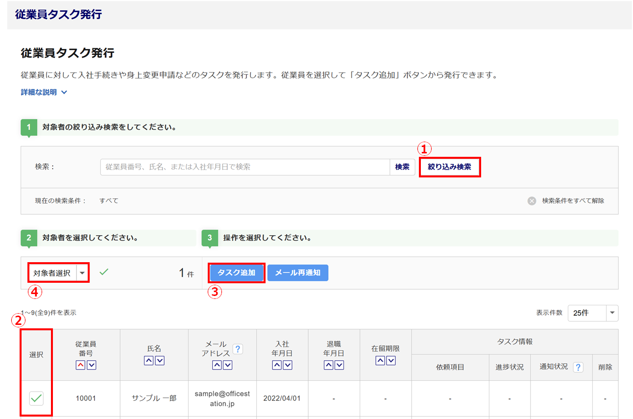 対象従業員の「選択」列(②)にチェックをつけ、[タスク追加](③)をクリックします。