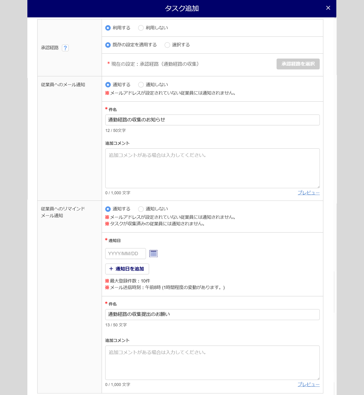 | 従業員へのメール通知 | タスク発行時に、従業員へメール通知をおこなうか否かを設定します。 ・通知する メール通知をおこなう場合に選択します。 メールの「件名」とメール本文内に「追加コメント」を任意に設定できます。 送信されるメールのイメージは[プレビュー]より、ご確認ください。 ※メールアドレスが登録されていない従業員には通知されません。 ※「件名」の初期設定は、「通勤経路の収集のお知らせ」です。 ・通知しない メール通知をおこなわない場合に選択します。 |